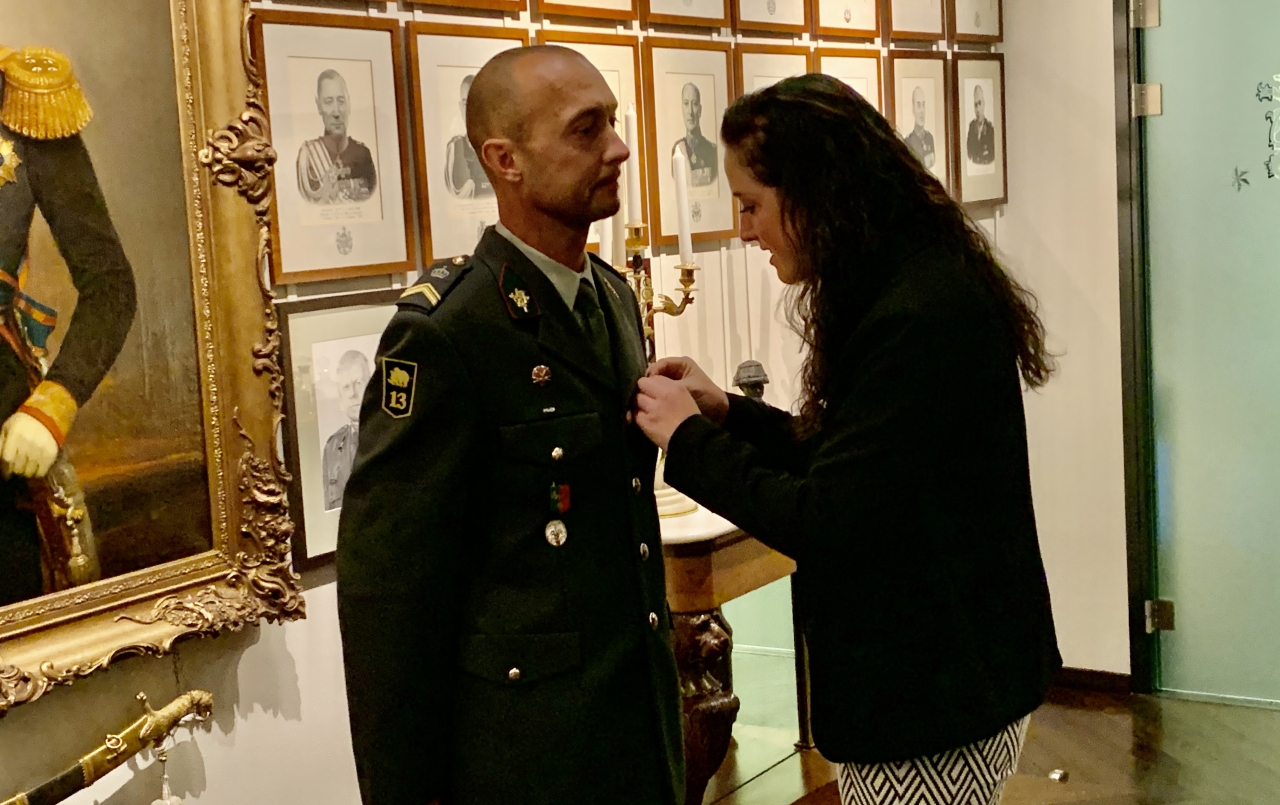 C-LAS persoonlijk leidde een klein gezelschap rond door onder andere de Prinsenkamer om uiteindelijk te eindigen in de Ruyter van Stevenicnk zaal. In bijzijn van zijn ouders heeft daar zijn vriendin het Ereteken van Verdienste opgespeld. Dit omdat er natuurlijk wel gewoon aan de Covid maatregelen voldaan moest worden. C-LAS heeft vervolgens een zeer persoonlijk verhaal gehouden over de redenen voor zowel het Ereteken van Verdienste in Brons om vervolgens het Sculptuur Operationeel Optreden te overhandigen. De gedachten gingen kort even terug naar de noodlottige 22e mei 2010. Generaal Martin Wijnen maakte duidelijk dat het optreden van Ronald Huijs, met name ook tijdens die zeer moeilijke omstandigheden een voorbeeld zijn van de kernwaarden van de Landmacht; Moed, Toewijding en Veerkracht. En natuurlijk geldt ook hier: Voor elkaar, altijd!