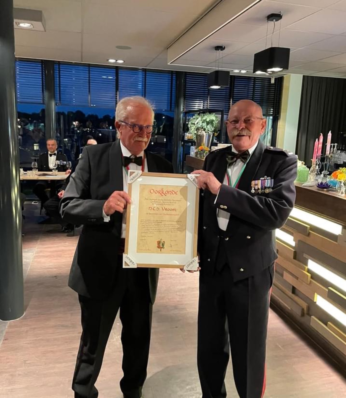 Tijdens het 68e Diner de Corps van Regiment Limburgse Jagers, dit keer in Valkenburg, werd luitenant-kolonel b.d. Nico Vroom benoemd tot ere-bestuurslid van de Stichting Regiment Limburgse Jagers vanwege jarenlange en uitzonderlijke inzet voor het Regiment. Het leverde hem een ovationeel applaus en oorkonde op. Proficiat!