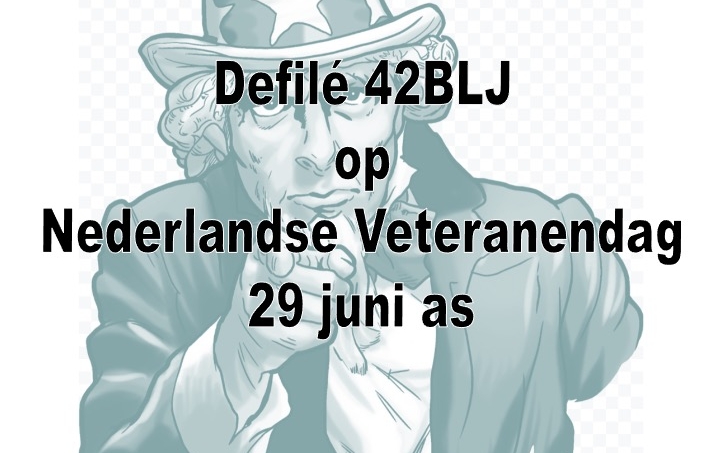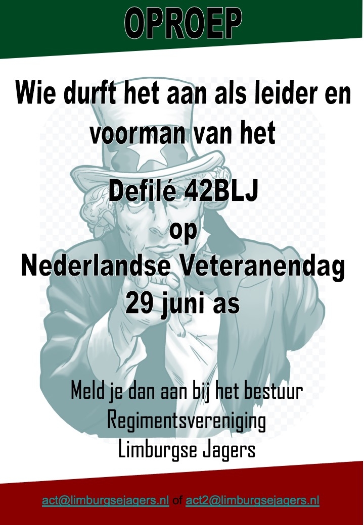 Op zaterdag 29 juni wordt voor de 20e keer de Nederlandse Veteranendag georganiseerd in Den Haag. Natuurlijk zijn wij daar als Regiment Limburgse Jagers ook weer bij. Zowel met een stand op het Malieveld als met twee detachementen bij het defilé. Eén detachement van parate Limburgse Jagers van 42 BLJ en één detachement van de Regimentsvereniging Limburgse Jagers. Natuurlijk duurt dat nog even maar nu alvast aandacht daarvoor. Zet het alvast in uw agenda, wij laten tijdig weten hoe je kunt opgeven.